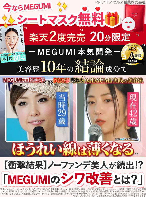 笑いジワが目立ちはじめ、化粧で隠してもファンデがシワにたまってしまうのが悩みのタネになっていました。この商品に出会い、今では鏡を見るのが楽しい毎日です!MEGUMIさんが開発したと知ってから気になっていましたが、やっぱり美容賢者と言われるだけあって、さすがMEGUMIさん!という感じでした!毎日のスキンケアが癒しの時間になる香りも大好きなので、これからも続けてみます♪
